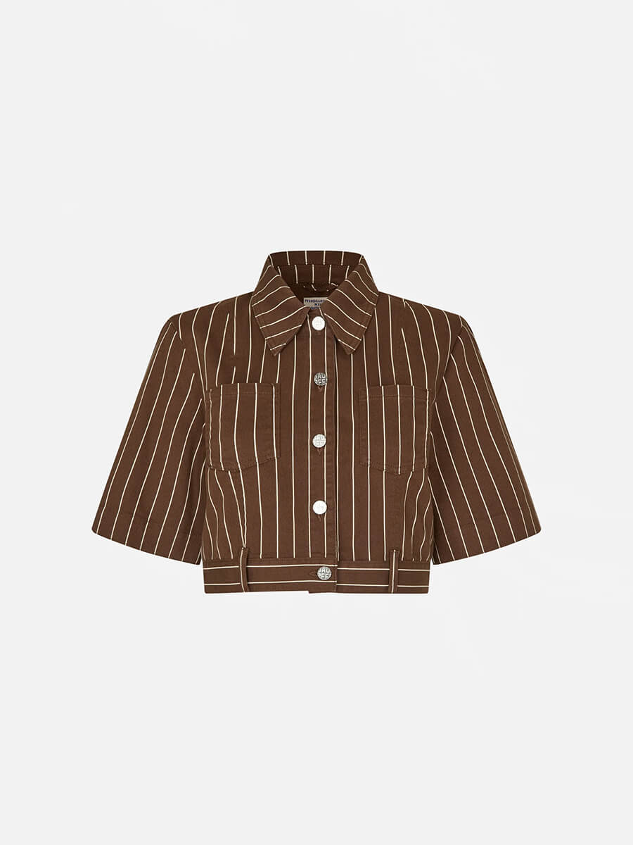 Putting a modern twist on a classic denim jacket, the Majsa Shirt by Baum Und Pferdgarten is a statement outerwear piece for the new season. This slightly cropped, pinstripe print jacket is made of denim with bold silver buttons, short wide sleeves, a pointed collar and front chest pockets.